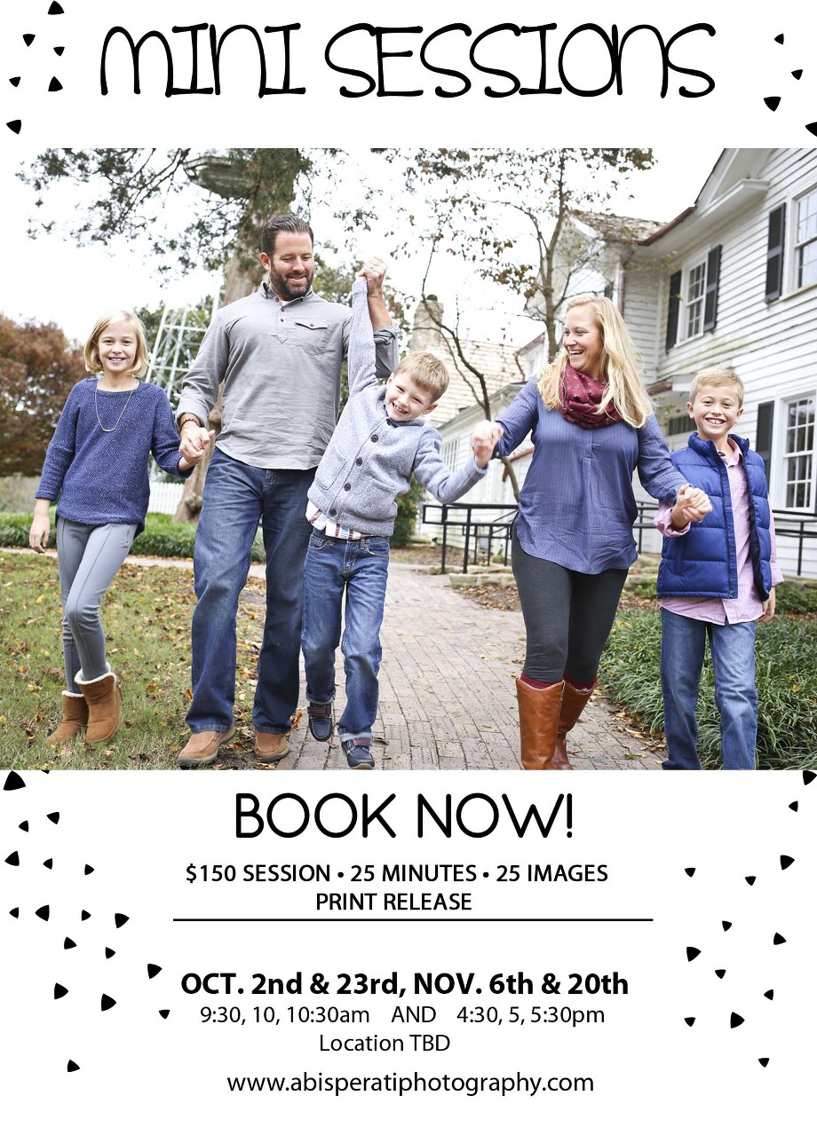 9.19.16 Fall Mini Sessions Are Here – Abi Sperati Photography Filed in: Children | Family | Mini SessionsTagged in: Abi Sperati Photography | Cary Family Photographer | Cary Photographer | Family Photographer | Fuquay Varina Photographer | Holly Springs Photographer | Lifestyle Photographer | Mini Sessions | Raleigh Photographer« Sweet Little Thing – Abi Sperati Photography – Raleigh Rose GardenLet Them Be Little – Abi Sperati Photography – Crowder Park, Raleigh NC » + - 4 comments September 23, 2016 - 3:57 am Veronica Torres - Nov 6 @ 10:30 am, how to book?ReplyCancel September 26, 2016 - 12:59 am abisperatiphotography@gmail.com - I just sent you an email with available date/time 🙂ReplyCancel September 23, 2016 - 1:59 pm Betty - What does $150 include?ReplyCancel September 26, 2016 - 12:55 am abisperatiphotography@gmail.com - Hi Betty! It includes a 25 minute session and 25 digital images with print release.ReplyCancel Your email is never published or shared. Required fields are marked * Name * Email * Website Comment Δ facebookpinteresttwittersubscribecontact
